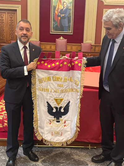 Al finalizar la conferencia, el Soberano Gran Comendador hizo entrega a Excmo. Sr. D, José Manuel Bermúdez, alcalde de Santa Cruz de Tenerife, de una réplica del estandarte del Supremo Consejo que será expuesto en el Centro de Interpretación de la Masonería que va a instalarse en el Templo Masónico de la calle de San Lucas.