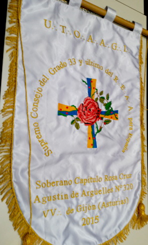 El estandarte del S.·.C.·.R.·.C.·. “Agustín Argüelles” Nº 320 que presidió los Primeros Encuentros de los Cuerpos de Castilla tiene un diseño muy especial, que es una obra de arte realizada por el M.·.S.·. Bernardino Rozada Fernández, 4º acreditado pintor asturiano, que plasma en sus obras múltiples símbolos masónicos que nos transmiten enseñanzas, ejemplos y emociones emanadas de su inspiración y nuestros rituales masónicos.
