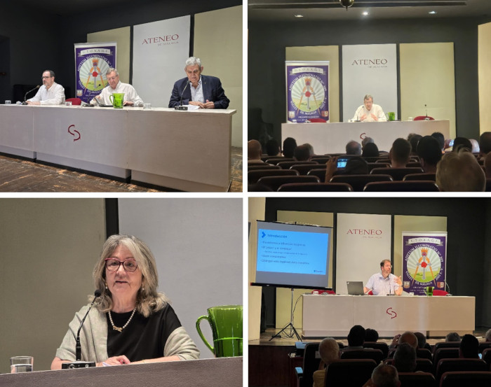 El sábado 31, el Ateneo de Málaga —fiel a su vocación de foro cultural abierto— acogió las magníficas ponencias sobre el simbolismo filosófico de la Masonería, del Profesor D. Pedro Álvarez Lázaro sobre «La Masonería escuela de formación Integral del Ciudadano”, de la Profesora Dña. María José Turrión sore la “Represión de la Masonería Femenina durante el franquismo” y del Profesor D. Luis Ignacio Gordillo Pérez sobre “El papel de la Masonería Filosófica en la edificación constitucional de España”, recreándose en todas ellas el legado ilustrado de la masonería y su influencia en figuras históricas clave. Tras cada intervención se generó un animado coloquio, donde la participación del público fue entusiasta y respetuosa, confirmando que el diálogo sereno y el pensamiento libre siguen teniendo cabida en estos tiempos de ruido e inmediatez.