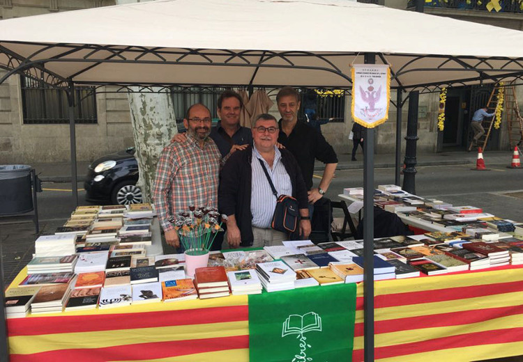 El “stand” de la Asociación Unión Fraterna porta en su cara frontal el banderín del Supremo Consejo del Grado 33º y Último del Rito Escocés Antiguo y Aceptado para España. Gracias por el esfuerzo realizado para que en este día fuera efectivamente una fiesta de progreso y superación tras los luctuosos y crueles atentados terroristas. ¡Sant Jordi siempre nos ayudará